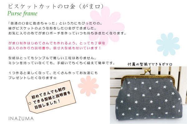 仕様 入数 1本(型紙付) 素材 鉄 注意点 がまぐちをはじめてつくる方にも、カンタン上手につくれるわかりやすい作り方と型紙のセットです。