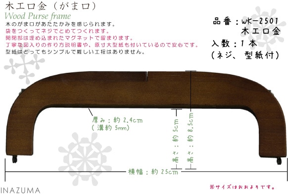 仕様 入数 1本(型紙付) 素材 鉄 注意点 がまぐちをはじめてつくる方にも、カンタン上手につくれるわかりやすい作り方と型紙のセットです。