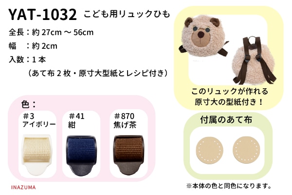 リュックひもの長さは約27~56cmに調節ができます。仕様 入数 1本(あて布2枚、原寸大型紙とレシピ付) 素材 アクリル、合成皮革 注意点 合皮には手縫いの穴があいているので、手縫いで縫い付けて下さい。