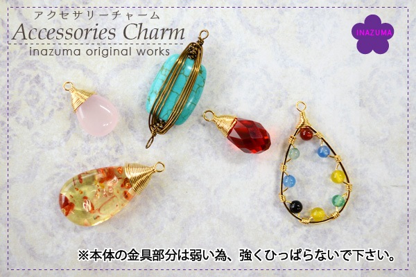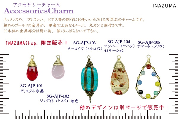 仕様 入数 1ケ(丸カン2ケ付) 素材 天然石・他 注意点 本体の金具部分は簡単なメッキだけの商品ですので、強く引っ張らないようにご注意下さい。