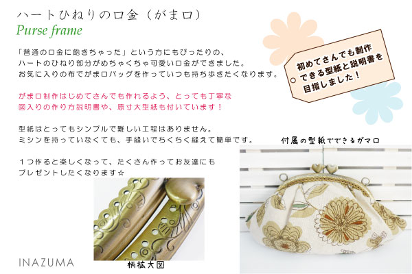 仕様 入数 1本(型紙付) 素材 鉄 注意点 がまぐちをはじめてつくる方にも、カンタン上手につくれるわかりやすい作り方と型紙のセットです。
