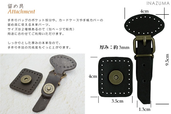 仕様 入数 1色1ケ 素材 本革、鉄 注意点 縫い穴にそって、手縫いで縫い付けてください。